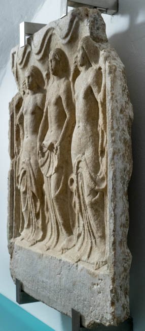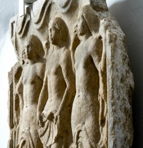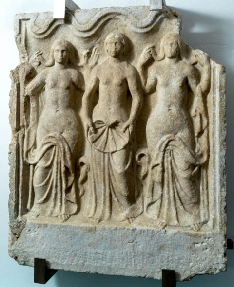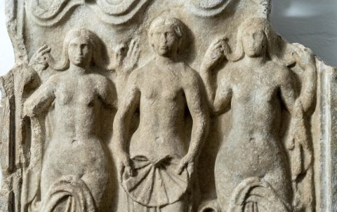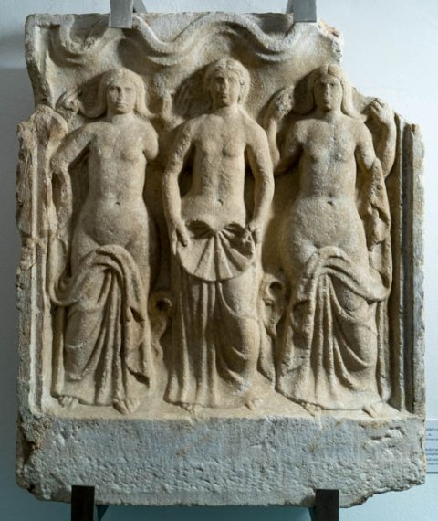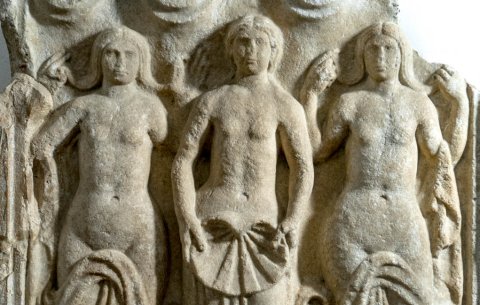 - Mythische Figuren: unter wellenförmig geschwungenem Rahmen drei stehende Quellnymphen mit entblößtem Körper, Mantel um die Beine geschlungen. Die mittlere hält mit beiden Händen eine Muschelschale, die beiden seitlichen drücken mit erhobenen Händen ihr Haar aus.