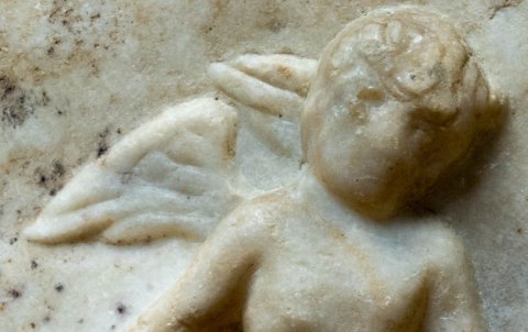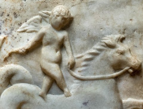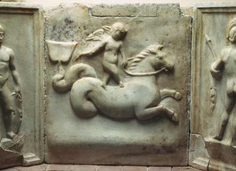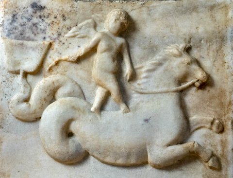 - Ungerahmtes Rechteckfeld mit Erot und Meerwesen. Unten horizontale Vorwölbung, darüber Hippokamp nach rechts, auf seinem Rücken stehender nackter geflügelter Knabe, hält mit der Linken den Zügel, in der Rechten die Peitsche.