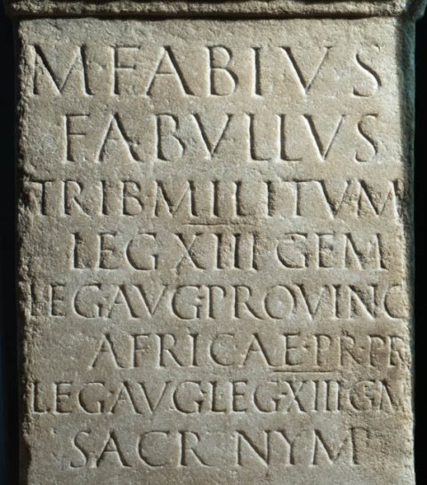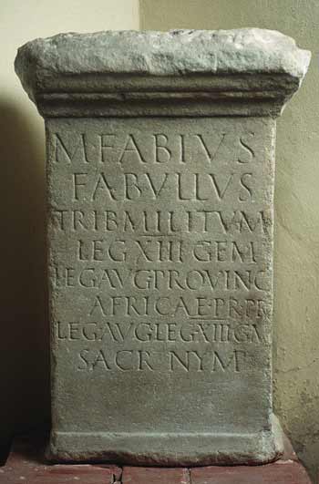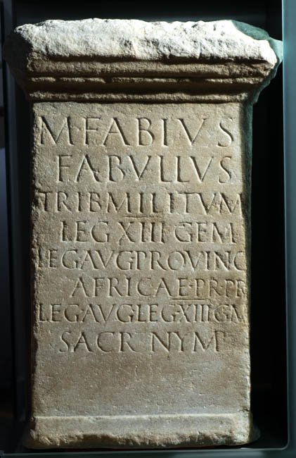 - M(arcus) Fabius / Fabullus / trib(unus) militum / leg(ionis) XIII Gem(inae) / leg(atus) Aug(usti) provinc(iae) / Africae pr(o) pr(aetore) / leg(atus) Aug(usti) leg(ionis) XIII Gem(inae) / sacr(um) Nymp(his)