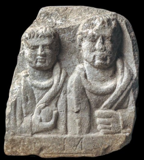 - Familie. Brustbilder von zwei Männern. Rechts: bärtig, Locken, Ärmeltunica, Sagum, Scheibenfibel. In der Mitte Jüngling: bartlos, gesträhntes Haar, Ärmeltunica, Sagum, in der Rechten Apfel. Links folgte weitere Person. Von Eckhart, CSIR, als Rundmedaillon mit drei Figuren rekonstruiert.