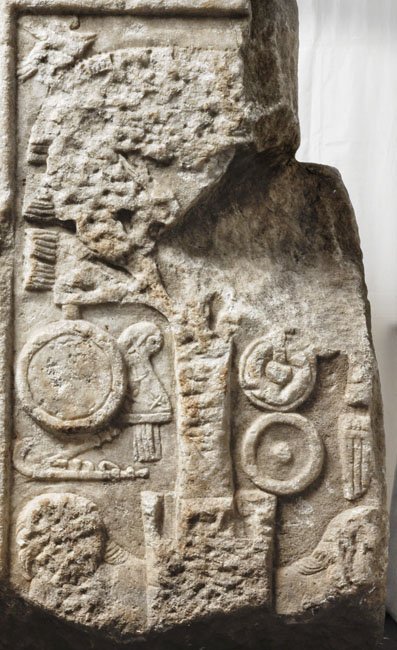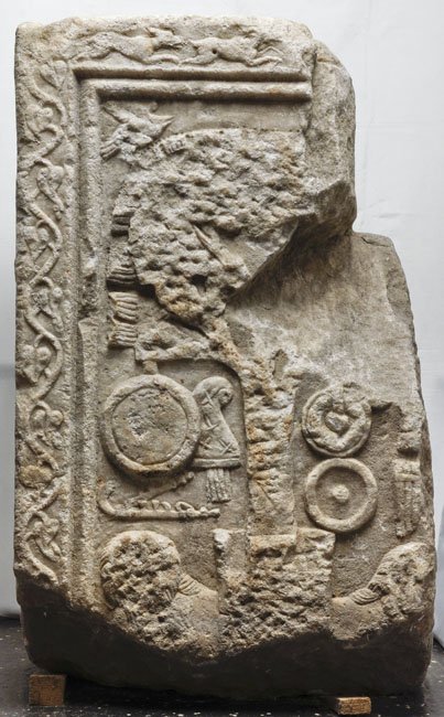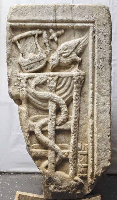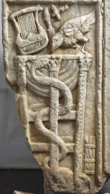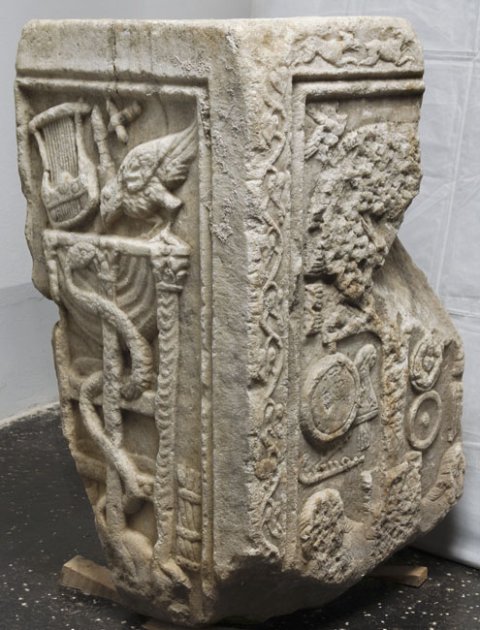 Eckblock: auf der Vorderseite Geräte, Musikinstrument, Waffen: gerahmtes Rechteckfeld, darin auf Felsgrund stehender Dreifuß, um den sich Schlange windet und auf dem ein großer Vogel (Rabe ?) sitzt. Rechts unten Rollenbündel, über dem Dreifuß Kithara, Schwertgriff (?) und Zwiebelknopffibel.