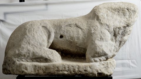 - stark verwittert, Kopf und Vorderpranken abgeschlagen