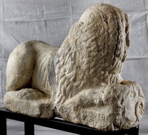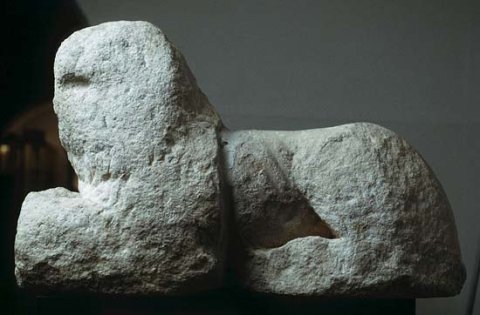 - Auf flacher Basisplatte liegender Löwe, Kopf zur linken Seite gedreht, Widderkopf in den Pranken.
