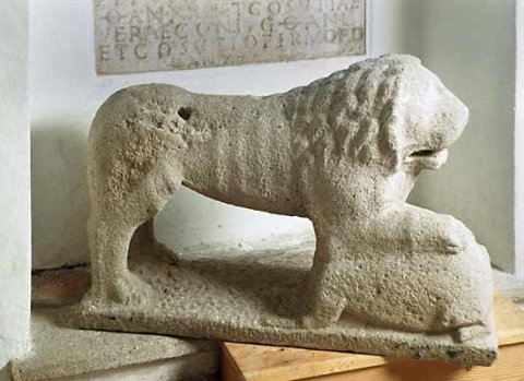 - Auf flacher Basis stehender Löwe, unter der rechten Vorderpranke liegender Eber.
