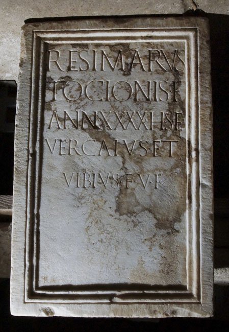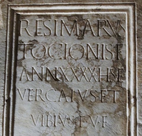 - Resimarus / Tocionis f(ilius) / ann(orum) XXXX h(ic) s(itus) e(st) / Vercaius et Vibius f(ilii) v(ivi) f(ecerunt)