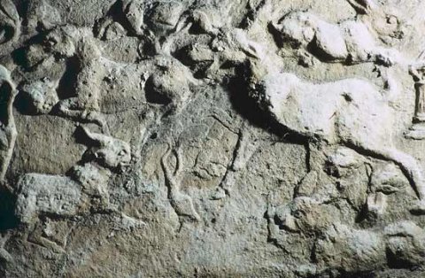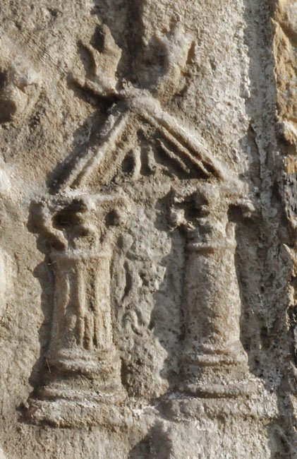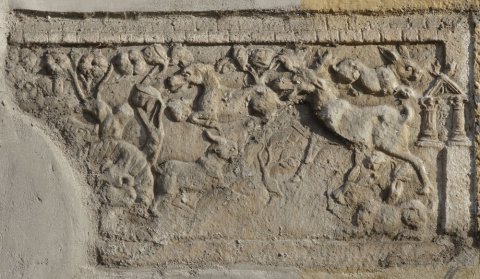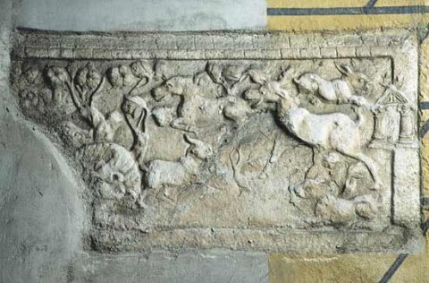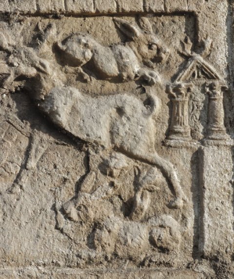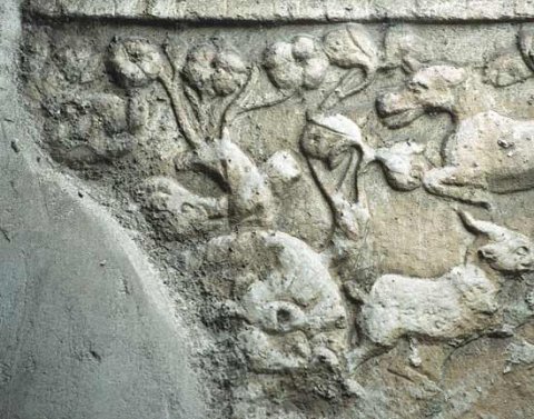 - Gerahmtes Rechteckfeld, der erhaltene obere Rahmen als Andeutung einer Mauer (?), den rechten Rand überschneidend kleiner Tempel (Giebel auf zwei Säulen, Mittelakroter). Im Feld verteilt stehende und liegende Tiere (Pferde, Hasen, Schafe, Schwein), links blühender Baum.