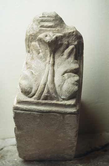 - Unter dem vorspringenden profilierten Auflager Akanthusblatt.