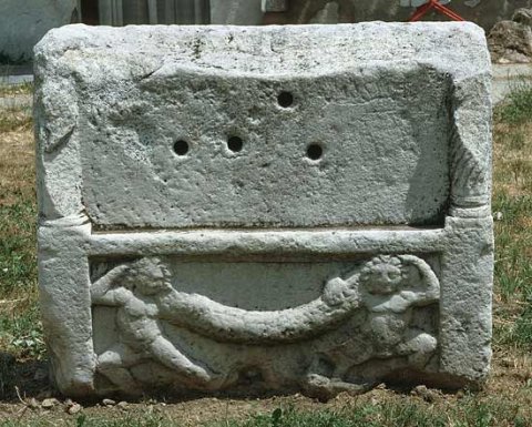 Im Sockelbild zwei nackte Knaben (Genius, Erot) mit Girlande). - Inschrift