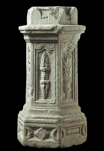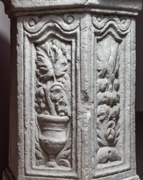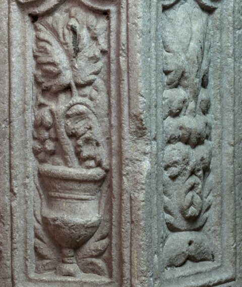 - Auf den Seitenflächen fünf gerahmte Bildfelder, obere Rahmenleiste mit Volutenenden. Von links: Krater mit Weinranken, Akanthusgewächs, Delphin, Blitzbündel, Krater mit Weinranken. die Seite zwischen den Krateren geglättet.