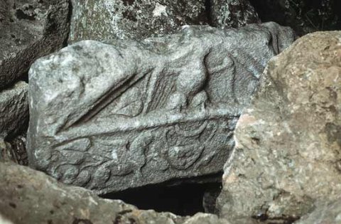- Im Giebelfeld Adler mit ausgebreiteten Flügeln, links Efeublatt. Auf der unteren Rahmenleiste Krater zwischen Greifen und Efeuranken.