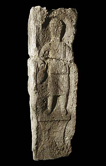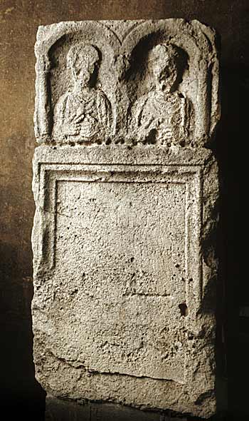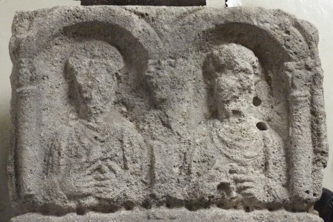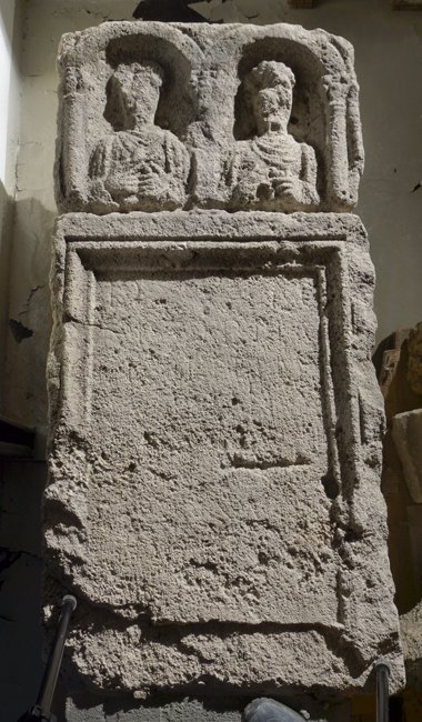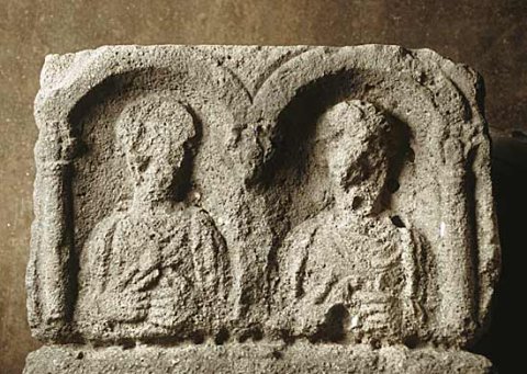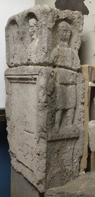 - Auf der Vorderseite Doppelbogen auf Säulen, Brustbilder von zwei Männern: Ärmeltunica, Sagum, Rolle (volumen) ?. Auf der linken Nebenseite Dienerin mit Flügelfibeln. Auf der rechten Nebenseite Diener: in Bogennische auf hohem Podest Mann in kurzer Tunica, in der Rechten Krug.