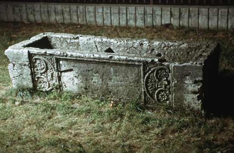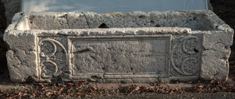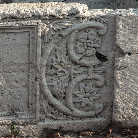 - Gerahmtes Schriftfeld zwischen mit Blattornament gefüllten Peltenschilden. In den Peltenbögen Rosetten, in den Zwickeln Blätter.