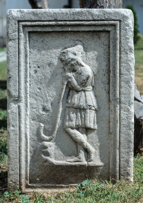 - Auf den Nebenseiten gerahmtes Rechteckfeld, darin auf niedrigem Podest mit Andeutung von Felsen stehender Attis, Beine gekreuzt, Hände und Kinn auf Pedum gestützt.