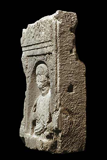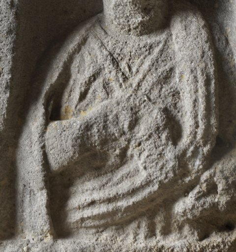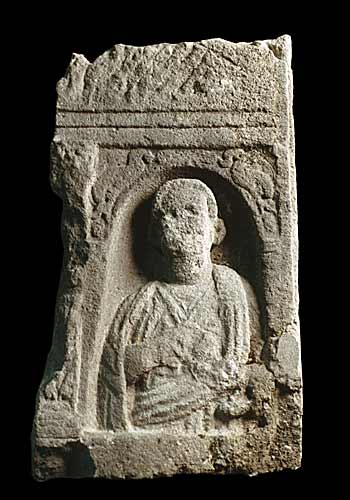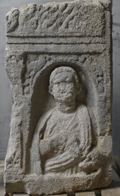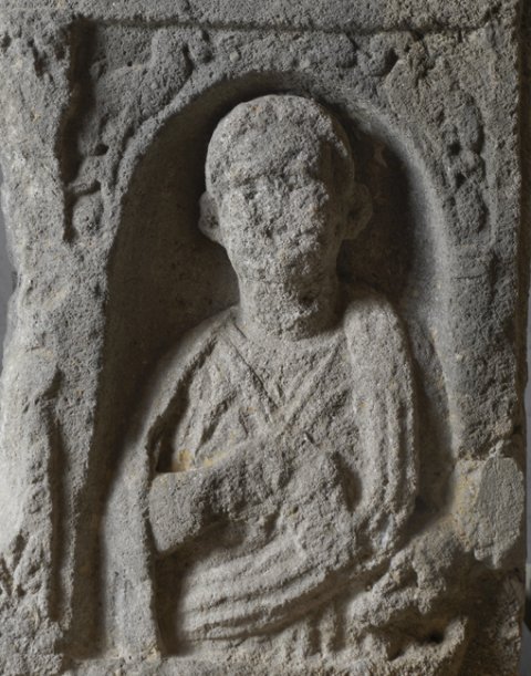Eckblock. Im Hauptbild zwischen Pilastern Bogennische, darin Halbfigur eines Mannes: bartlos, Tunica, Toga, Rolle (volumen). Über dem Bogen Delphine.