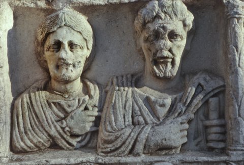 Im Hauptbild zwischen Säulen mit Blattschuppen zwei Brustbilder (Ehepaar): links Frau, fein gesträhntes Haar mit Mittelscheitel, Tunica, Mantel, Halsband, Armreif. Rechts Mann, bärtig, Locken, Ärmeltunica, Toga contabulata, in der Linken Rolle (volumen).