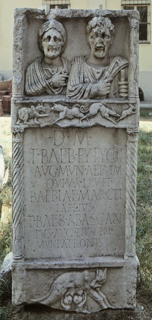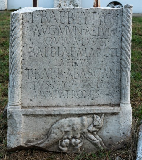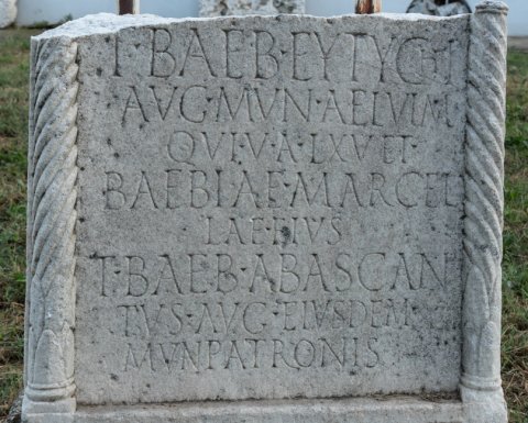 - D(is) M(anibus) / T(ito) Baeb(io) Eutychi / aug(ustali) mun(icipii) Ael(ii) Vim(inacii) / qui v(ixit) a(nnos) LXV et / Baebiae Marcel/lae eius / T(itus) Baeb(ius) Abascan/tus aug(ustalis) eiusdem / mun(icipii) patronis