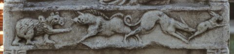 Im Zwischenfries Tiere: links Bär und Eber, rechts Hund verfolgt Hasen.