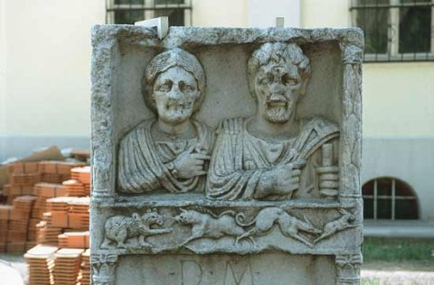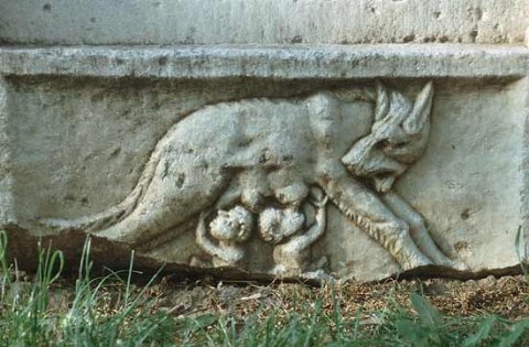 Schriftfeld zwischen Säulen mit Blattkapitellen und Spiralkanneluren und Blattschuppen. Im Sockelbild Mythos (Lupa Capitolina). - Inschrift