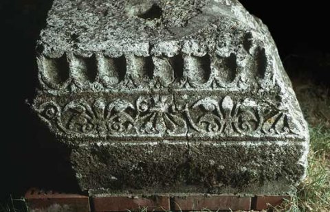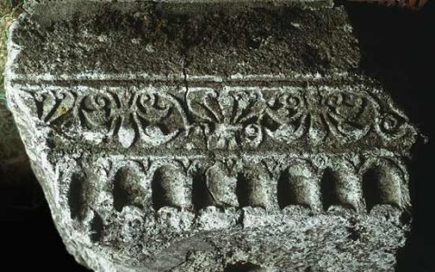 - An drei Seiten umlaufender Palmettenfries, darunter Pfeifenstab.