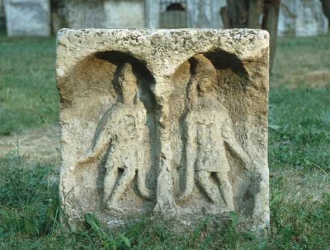 - Mythische Figur : zwei rundbogige Nischen, durch eine Säule getrennt. In jeder eine Attisfigur mit phrygischer Mütze, auf Pedum gelehnt. Teil eines Grabmals ?