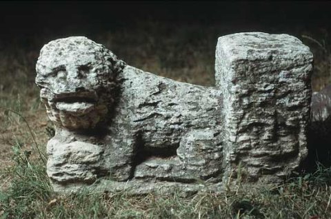 - Auf flacher Basisplatte liegender Löwe, Kopf nach links gedreht, Hinterteil von kubischem Block überschnitten (auf der Vorderseite Reliefrest: Kopf ?).