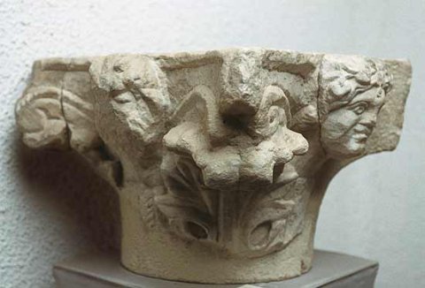 - Mythische Figur (Mänade, Silen ?) : zwischen Voluten aus Akanthuskelch ragende menschliche Köpfe (gut erhaltener Frauenkopf mit Efeukranz, abgeschlagener bärtiger Silens(?)kopf).