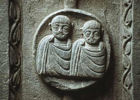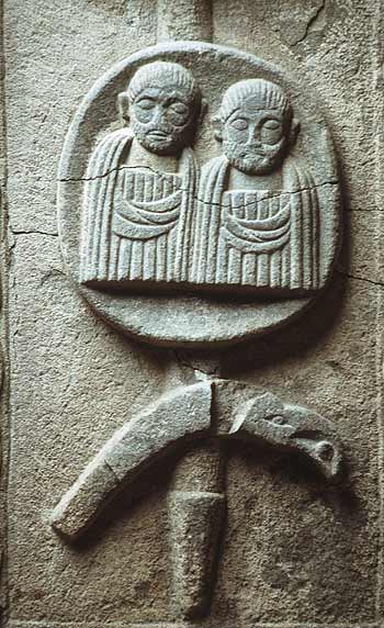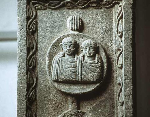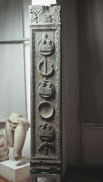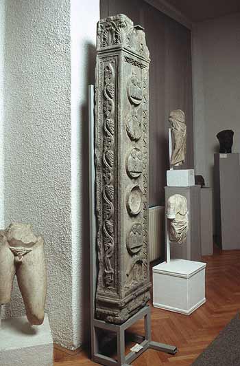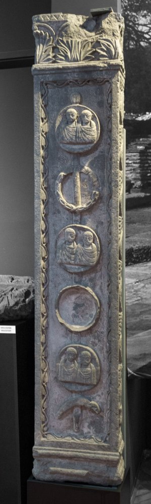 Auf der Vorderseite gerahmtes Feld, darin Standarte: Stange mit Knauf, an der drei Medaillons mit je zwei Kaiserbüsten befestigt sind, dazwischen ein Kranz und eine Schale. Unten Adlerkopf. Auf dem Rahmen Efeuranke, auf dem Kapitell Akanthusblätter.