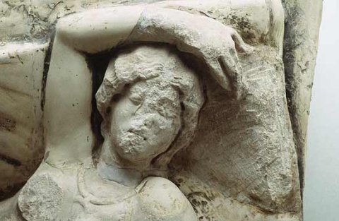 - oberer Teil und Partie um den linken Arm ergänzt, Relief bestoßen