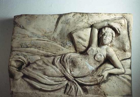 - Mythos : ungerahmtes Rechteckfeld mit Andeutung von Felsgrund. Schlafende Ariadne mit über den Kopf gelegten rechten Arm, Oberkörper entblößt, Halskette mit Lunula, gewelltes Haar mit Mittelscheitel.