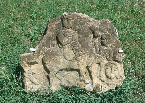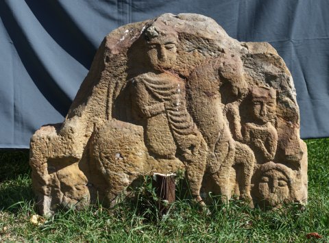 - In Bogenfeld Reiter (Soldat) mit Sagum, vor dem Pferd stehender Calo, unten links männlicher, rechts weiblicher Kopf en face. Unter dem Pferd Spuren eines Gefallenen ?