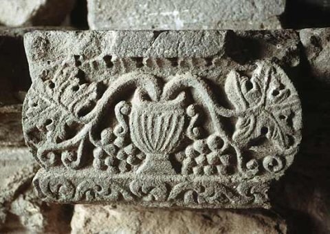- Aus Gesims vorkragendes Auflager für Säulen einer Aediculafront : zwischen Blattstab oben und Leiste mit Spiralranke unten kannelierter Krater, aus dem Weinranken wachsen. Weinblatt auf den dreieckigen Seitenflächen.