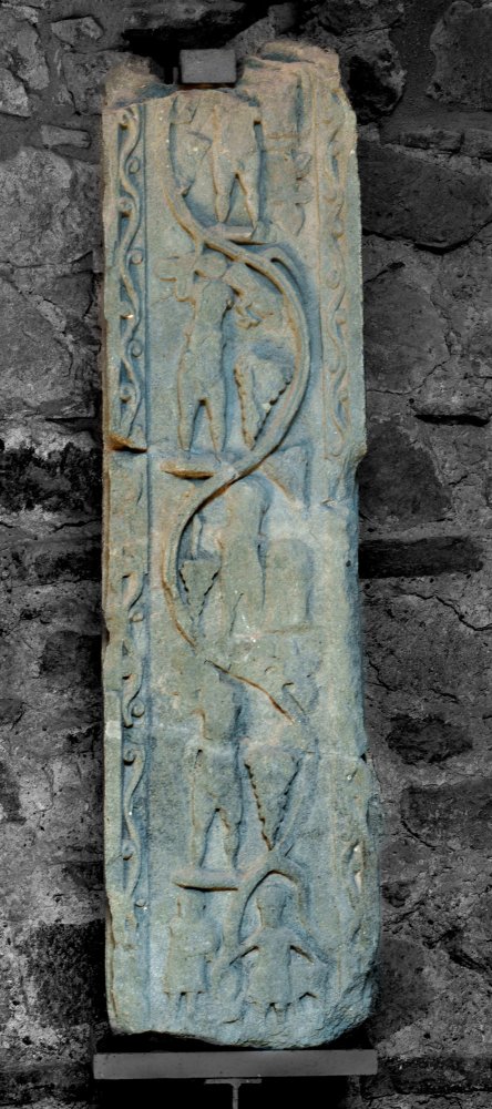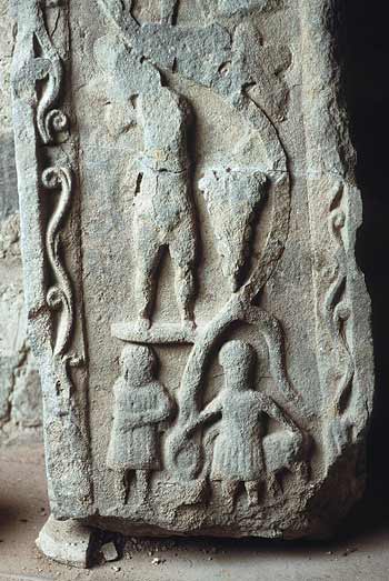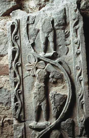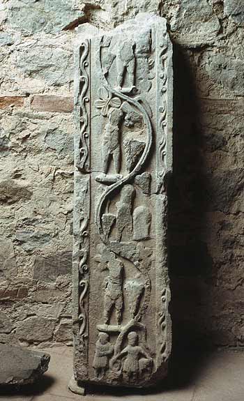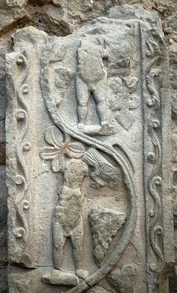 Auf der Vorderseite vertieftes Feld zwischen Rahmen mit Spiralranken. In einer Weinranke stehen übereinander vier Eroten auf kleinen Standleisten. Am unteren Ende der Weinranke stehen zwei Figuren in kurzem Gewand an einem Altar (?), über den die rechte Figur eine Schale ausgießt, während sie mit der linken Hand ein Schaf (?) hält.