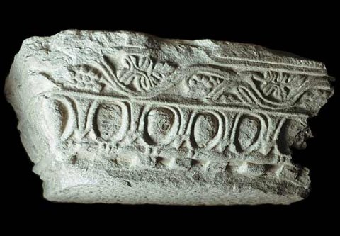 - Zahnschnitt, darüber Eierstab und Fries mit Weinranke