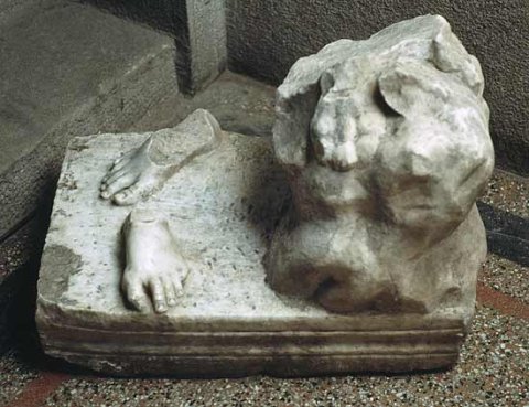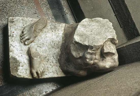 - Erhalten sind der Kopf und die Plinthe mit den Füßen.