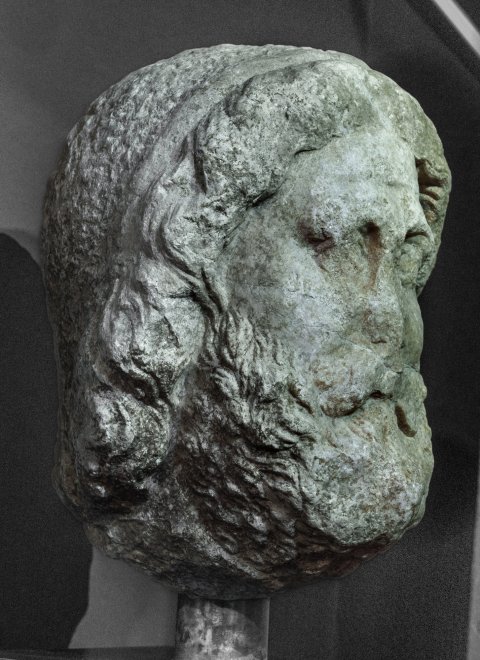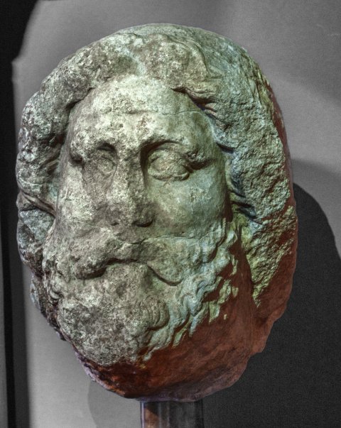 - Mythische Figur (Jupiter) : Kopf einer Kolossalstatue mit gewelltem langen Haar mit Binde und lockigem Vollbart.