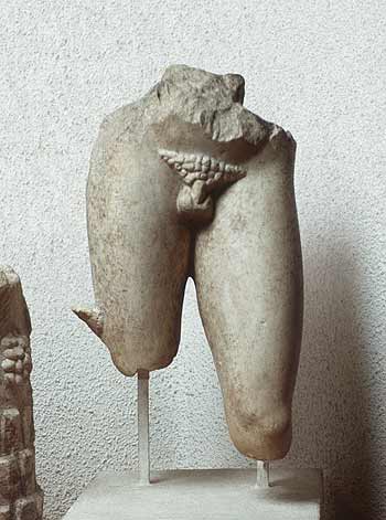 - Mythische Figur (Apollon ? Dionysos ?) : nackte stehende Jünglingsfigur, am rechten Oberschenkel Ansatz einer Stütze in Form eines Palmstamms, an dem Dattelbüschel (Weintrauben ?) hängen.