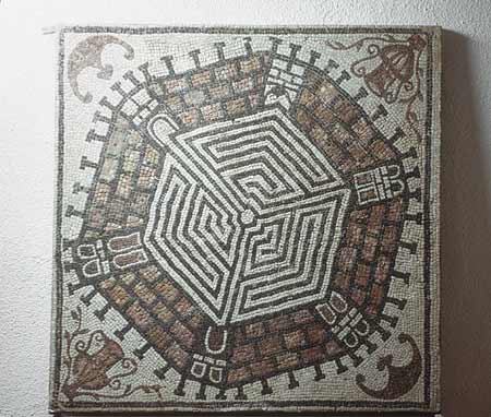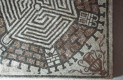- Fußboden des Vestibüls des Kaiserpalastes : auf weißem Grund mit schmalem schwarzen Randstreifen sechseckiges Labyrinth, umgeben von Quadermauern mit stilisierten Zinnen und sechs Tortürmen. In den Eckzwickeln je zwei Kratere und zwei Peltenschilde.