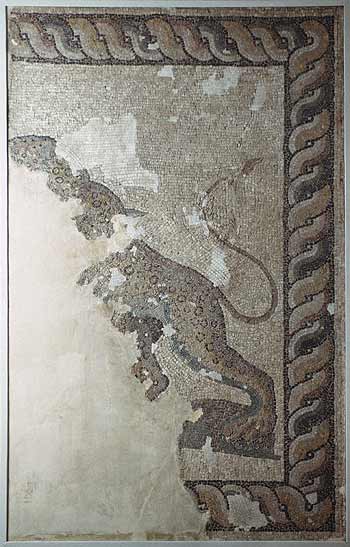- Bodenmosaik mit Jagdszene : Heller Grund mit Flechtbandrahmen. Links ein stehender und ein vor ihm hinter einem großen Rundschild kauernder Mann mit Speer, beide bartlos und mit lockigem Haar. Der stehende Jäger im grünen Ärmelgewand mit Gürtel und verzierten Borten, um den linken Unterarm eine Wurfleine. Beim knienden Jäger noch Rest des blauen Gewandes und ein geschnürter Stiefel sichtbar.Vom rechten Rand her greift eine aufgerichtete gefleckte Raubkatze an.