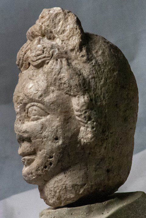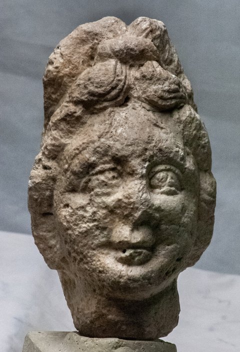 - Mythische Figur (Diana): Kopf einer Statuette, Frisur mit Mittelscheitel, über der Stirn Krobylos, die Pupillen gebohrt, der Mund lächelnd.