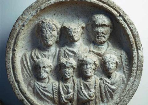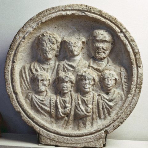 - Familie : Halbfiguren von drei Erwachsenen und vier Kindern. Oben links Frau: Perlenkette, Mantel. In der MItte Jüngling: bartlos, Sagum. Rechts Mann: bärtig, Sagum mit Fransen. Vorn links Knabe im Sagum mit Fransen. In der Mitte zwei Mädchen mit Perlenkette, Mantel, in der Rechten Frucht (?). Rechts Knabe im Sagum.