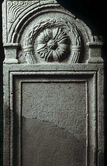 - Unter profiliertem Bogen auf niedrigen Pfeilern Lorbeerkranz (unten vom Bildrand beschnitten) mit großer Rosette im Inneren. In den Zwickeln über dem Bogen Palmetten.