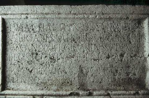- D(is) M(anibus) // Iulia Charitine vix(it) an(nos) XLV T(itus) Cl(audius) / Valerianus mil(es) leg(ionis) VII Cl(audiae) stip(endiorum) IIII / vix(it) an(nos) XXII T(itus) Cl(audius) Valens vet(eranus) ex tess(erario) / leg(ionis) s(upra) s(criptae) coniugi et filio karissimis b(ene) m(erentibus) p(osuit) / et se vivo et Iuliae Valentiae et Titis Claudiis / Valentino Valenti et Valentioni filis fecit