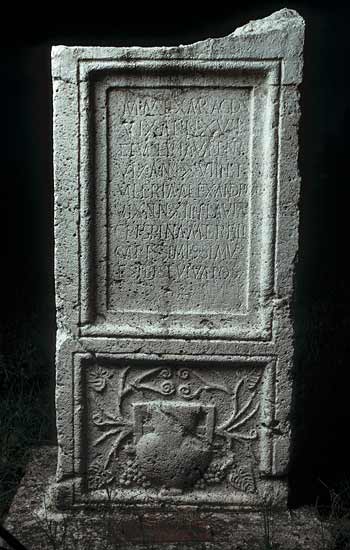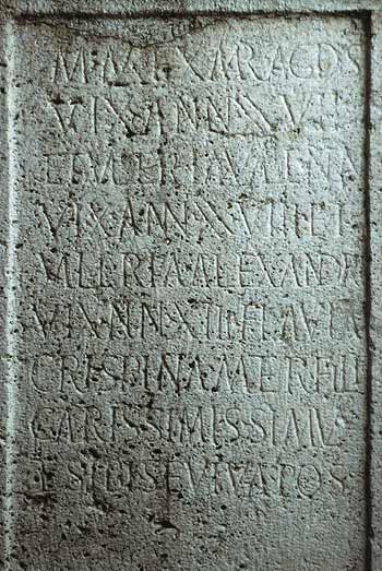 - [D(is) M(anibus)] // M(arcus) Aur(elius) Exmaragdus(!) / vix(it) ann(os) XXVII / et Valeria Valentina / vix(it) ann(os) XXVIII et / Valeria Alexandria / vix(it) ann(os) XIII Flavia / Crispina mater fili(i)s / carissimis simul / et sibi se(!) viva pos(uit)