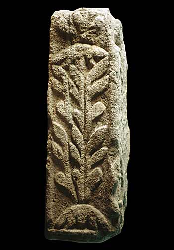 Eckblock: auf der Vorderseite Trauergenius: nackter geflügelter Knabe mit gesenkter Fackel, in der Rechten Weintraube und -blatt.