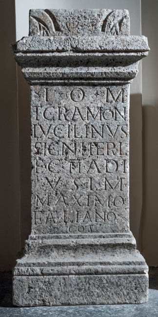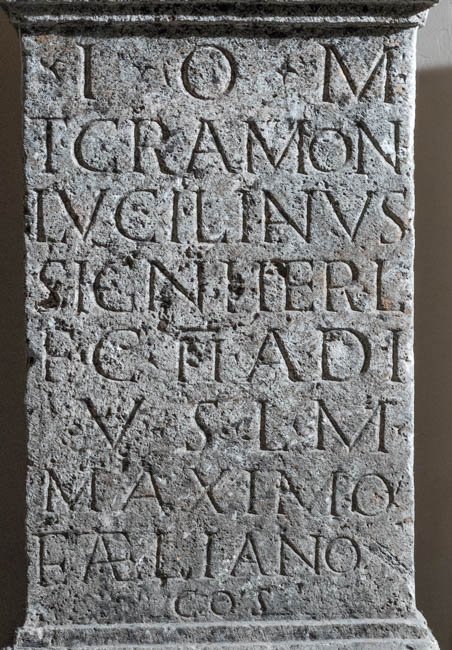 - I(ovi) o(ptimo) m(aximo) / T(itus) Gramon(ius) / Lucilianus / signifer l/eg(ionis) II Adi(utricis) / v(otum) s(olvit) l(ibens) m(erito) / Maximo / et Aeliano / co(n)s(ulibus)