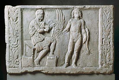 - Mythos: in Rechteckfeld links auf Hocker sitzender Daedalus in kurzem Gewand und Schuhen, an einem Flügel arbeitend. Vor ihm stehender nackter Ikarus mit Flügel an der linken Schulter. Seitlich schmale Felder mit Blattornament (Akanthuskelche).