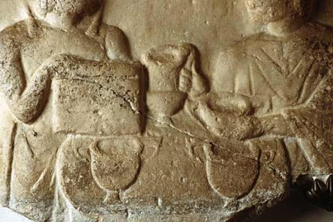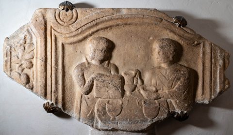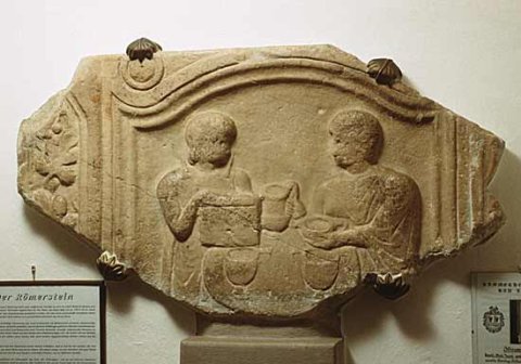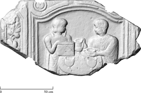 - Totenopfer: unter flachem Bogen mit Volutenenden runder Tisch mit Gefäßen, links einheimische Dienerin mit Obergewand mit Doppelknopffibeln, die Rechte liegt auf einem großen Behälter (Kästchen ?), rechts Diener, in der Rechten Kanne, in der Linken Henkelschale. Seitlich schmale Felder mit Giebel und Weinranke.