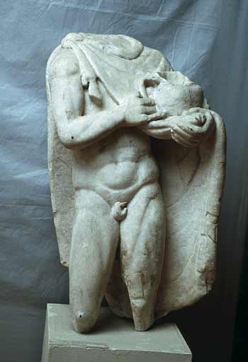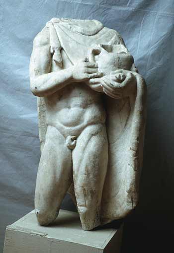 - Mythische Figur : stehender nackter Satyr mit Gefäß in den Händen. Auf der rechten Schulter verknotete Nebris.