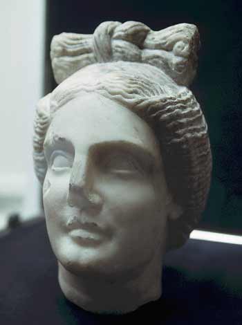 - Mythische Figur (Venus ? Diana ?) : idealisierter weiblicher Kopf mit gewelltem Haar mit Mittelscheitel und großer Haarschleife.