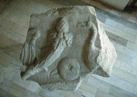 - Zone über einer Bogenöffnung. Mythische Figur (Genius ? Victoria ?) : Links: rechte Hand einer geflügelten Figur, die ein Füllhorn mit Früchten und großem Pinienzapfen hält. Gegenüber Vorderteil eines Pfaus. Dazwischen großer Granatapfel. Oben und unten Rest einer glatten Rahmenleiste, die untere bogenförmig.